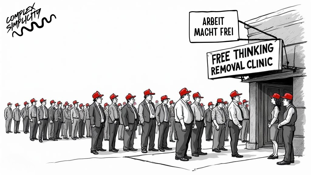 I've documented this phenomenon before in "The Philosophical Suicide and The Red Hat Cult," how millions of Americans murdered the thinking parts of themselves to gain entry to Trump's simulacrum. They wanted a father who'd never ask them to clean their room, only to blame the mess on someone else. The price of admission was simple: kill your capacity for independent thought, and you are in.